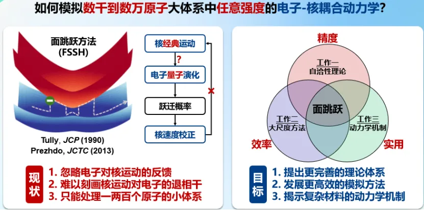 大尺度非绝热动力学涉及成千上万原子和大量电子能级,需要刻画强烈耦合的电子与原子核运动,是理论化学的重大挑战。对此,王老师提出了细致内在自洽原理,建立了自洽的混合量子-经典动力学理论,正确刻画了非绝热耦合局域时的量子退相干,在大量标准测试体系中系统提高了非绝热动力学模拟的精度;发展了不依赖非绝热耦合的非绝热动力学方法,通过电子哈密顿矩阵和退相干时间的机器学习,大幅提升了大尺度非绝热动力学模拟的效率。
