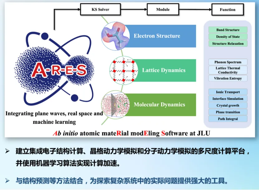 在高压、高温等非标准条件下,材料的结构稳定性与物理性质呈现出复杂的依赖关系,这对理论建模提出了严峻挑战。为应对这一问题,谢老师团队开发了第一性原理材料模拟软件 ARES。该软件基于实空间有限差分与平面波方法,具有高精度与优异的并行扩展性,能够高效执行复杂体系的电子结构计算、结构优化及分子动力学模拟任务。为了提升材料预测能力,ARES 集成了机器学习模块,支持基于主动学习的结构搜索与高精度机器学习势函数构建。在确保计算精度的前提下,大幅降低了大规模结构模拟的成本。通过高通量结构搜索与机器学习加速的势能面建模相结合,ARES 成功识别并预测了多种高压稳定相及其相关性质。尤其在多元复杂体系中,ARES 展现出对潜在稳定结构的高效发现能力。目前,ARES 已广泛应用于氧化物、硼化物、氢化物等材料体系,在理论预测与实验验证之间架起了重要桥梁,为新材料的高效发现与性能调控提供了强有力的技术支撑。