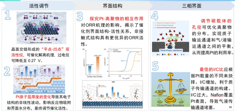 基于上述背景,李老师分别针对低铂催化剂和非贵碳基催化剂,采用密度泛函理论计算、分子动力学、粗粒化模拟等多尺度模拟,结合微观分子动力学方法,展开反应机理解析、催化剂设计、三相界面构筑等方面的研究。针对低铂催化剂,重点阐述了多晶面交错结构和晶面层数对反应机理、催化剂电子结构以及催化活性的影响规律;三相界面离聚物对铂基本征活性、质子通道与反应通道以及催化剂利用率的影响机制。针对碳基催化剂,重点解析了杂原子掺杂对本征活性的影响规律,多结构因素对活性位密度调控,以及失活机理等。为新型高性能燃料电池催化剂材料研发提供了理论支撑。