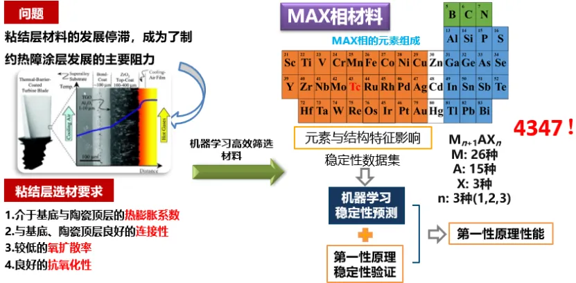 机器学习可与现有理论模拟方法结合用于陶瓷材料的评价和筛选,例如连续纤维增强陶瓷基复合材料和三元层状过渡金属化合物MAX(MAB)相。柏老师采用断裂相场法生成数据训练出一个深度学习模型实现了对SiC纤维增强SiC陶瓷复合材料裂纹扩展路径的快速高精度预测,计算速度提升1-2个数量级。而基于第一性原理计算和文献报道的实验结果,采用机器学习模型分析环障涂层材料稀土硅酸盐的热膨胀系数和热导率,定量化显示了化学组成和微观结构参数的影响,实现了热膨胀系数和热导率的精确预测。进一步的,柏老师采用文献报道结果训练出一个机器学习模型用于分析和预测MAX相的物相稳定性,仅根据元素组成即可实现对稳定性的快速预测,经第一性原理确认后筛选出一系列新型化合物并成功合成出新型Ti2SnN。