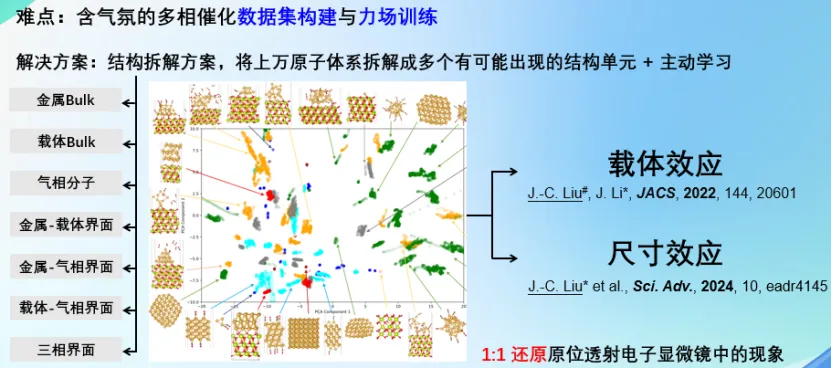 烧结是负载金属纳米颗粒催化剂中最重要的失活方式之一。因此,了解载体对烧结行为的影响至关重要。刘老师通过原位球差校正透射电子显微镜和深度势能分子动力学计算模拟,揭示了金纳米颗粒和各种载体之间的原子尺度动态相互作用。研究发现,与非晶态二氧化硅上的金纳米颗粒相比,氧化铈上的金纳米颗粒具有更小的接触角,并且在表面台阶处的流动性明显较小。与液滴亲水性的概念类似,刘老师将小纳米颗粒的烧结迁移归因于亲金属性,它决定了金属与载体之间的相互作用。从头算分子动力学和基于机器学习的深度势能分子动力学模拟直接观察到二氧化硅表面的烧结过程和金在氧化铈上的强结合作用,并揭示了负载纳米金催化剂的尺寸效应本质,为该类催化剂的研发提供了新的理论支撑。