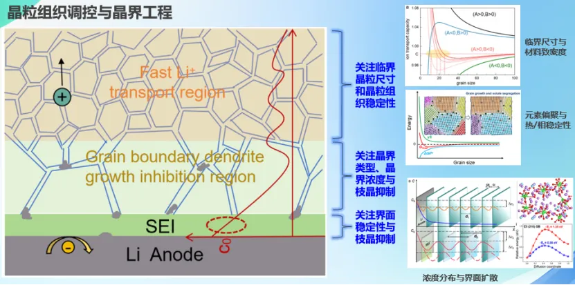 基于此,唐老师围绕固态电解质离子传输动力学和枝晶形核机制,构建了多尺度模型。引入晶粒尺寸效应定量描述了多晶固态电解质中离子电导率随晶粒尺寸的变化关系,揭示了多因素耦合下晶界对离子电导率的影响机制。结合第一性原理计算和数理模型,从微观尺度探讨了晶界对锂传输特征的影响及枝晶形核的作用机制。进一步地,通过有限元模拟从宏观尺度论证了特殊锂传输形式存在的可能性,进而提出多晶体固态电解质材料晶粒组织的非对称设计策略,为开发兼顾高离子电导率和枝晶抑制能力的固态电解质提供了理论指导。