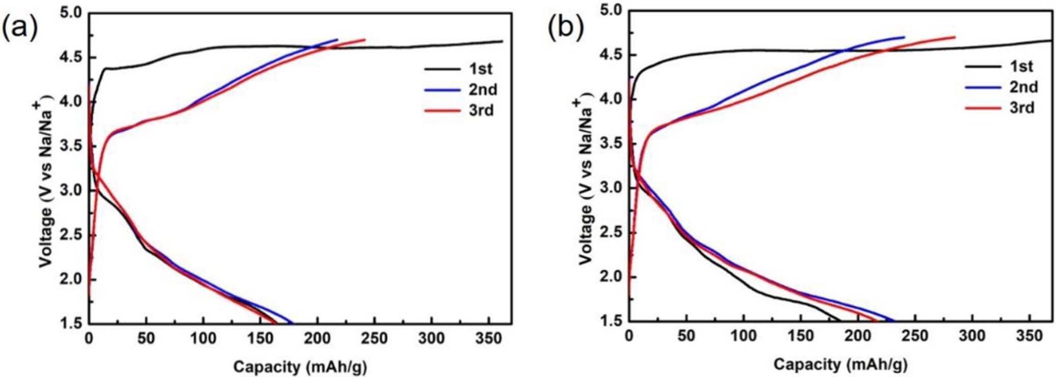 图2. Na2SeO3和(b) BM- Na2SeO3在1.5 ~ 4.7 V、10 mA g−1条件下的第一、第二和第三条充放电曲线。[1]