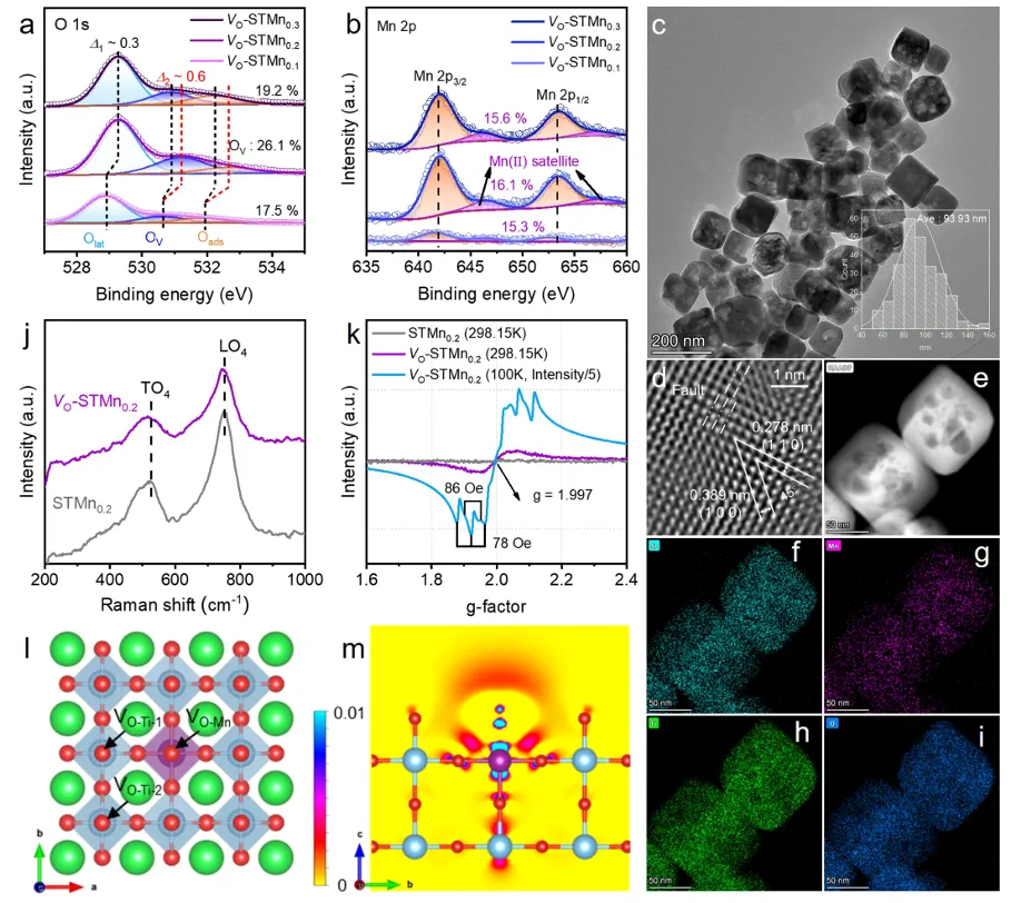 图2a/b:XPS中O1s峰位上移,Mn2+比例增加,支持氧空位增多。图2j/k:Raman与ESR均验证氧空位与低配位Mn的协同存在。
