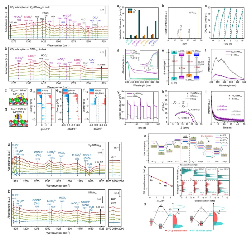 钙钛矿型氧化物SrTiO3具有稳定结构和良好的电子性能,但其光吸收范围有限,且缺乏高效的活性位点。近年来的研究表明:通过过渡金属掺杂和引入氧空位,可以有效调节其能带结构和表面反应位点。然而,如何利用这些结构调控实现高选择性的CH4生成,机制尚不清晰。