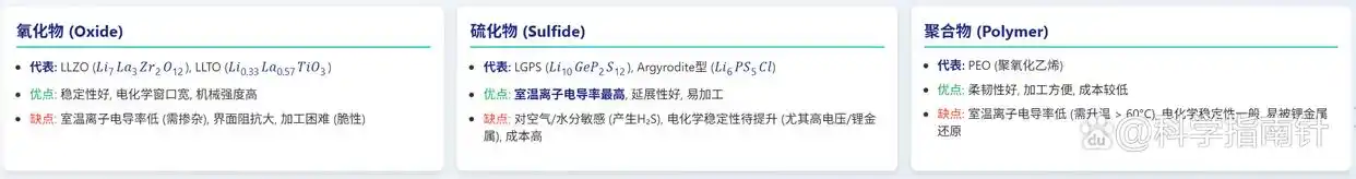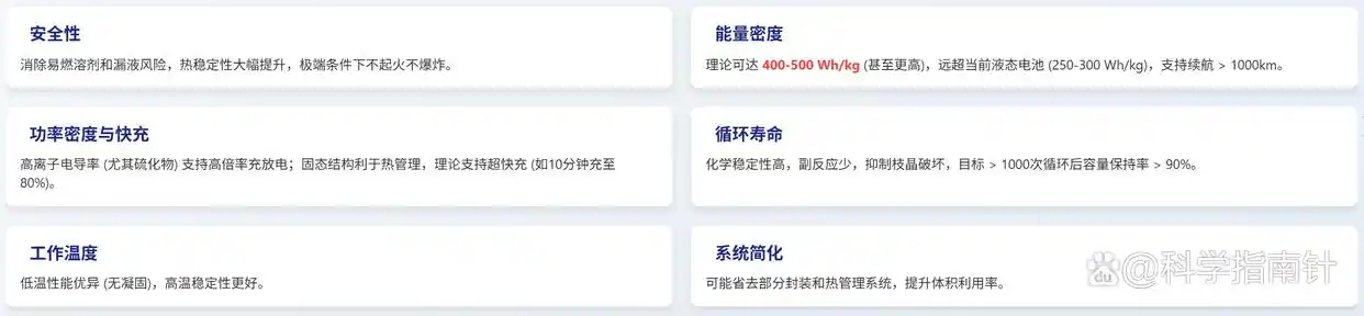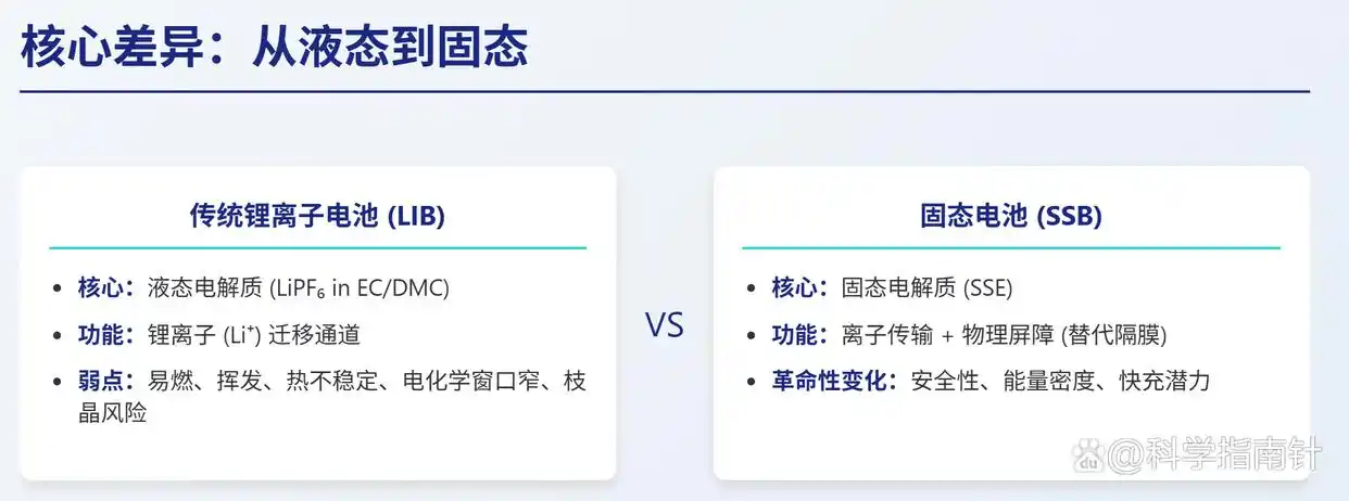 固态电池:核心在于固态电解质(Solid-State Electrolyte, SSE)取代了液态电解质和隔膜。SSE既是离子传输的介质,也是物理屏障。