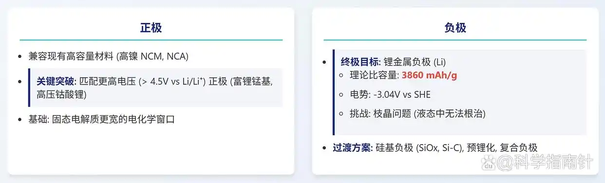 正极: 可以兼容现有高容量材料(如高镍NCM, NCA), 更重要的是可以匹配更高电压(>4.5V vs Li/Li⁺) 的正极材料(如富锂锰基、钴酸锂高压化),从而显著提升能量密度。固态电解质更宽的电化学窗口是基础。