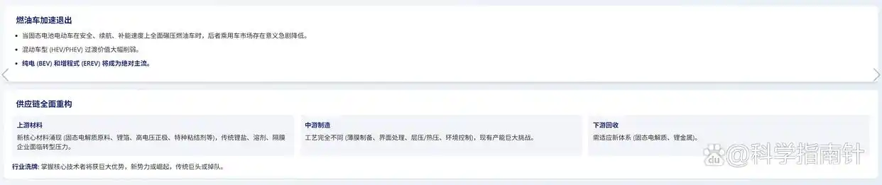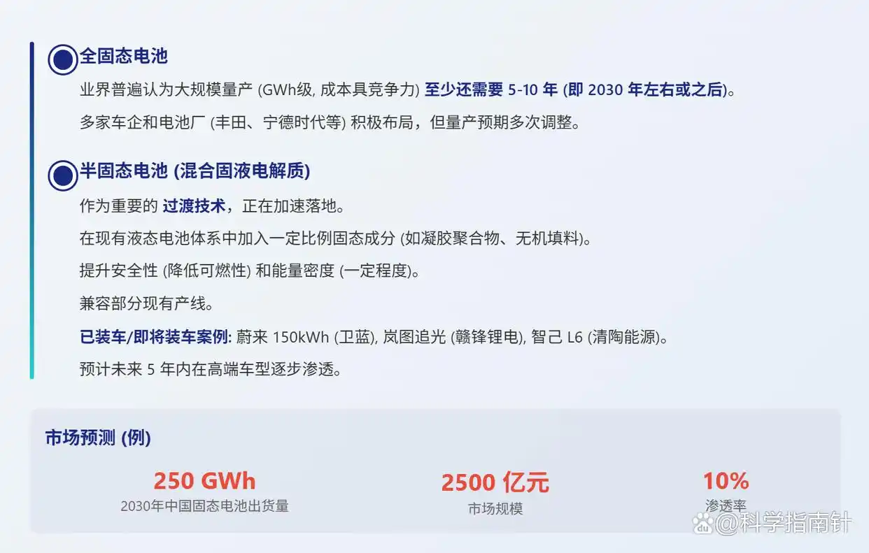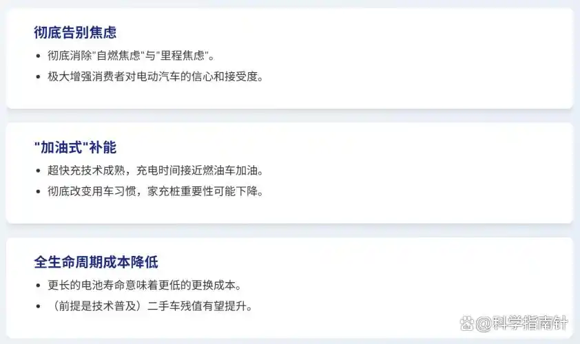 “现有电动车变垃圾”是极端言论: 液态锂电池技术仍在持续进步(如CTB/CTC、磷酸锰铁锂、4680等),其成熟度、成本优势和庞大的产能将在相当长一段时间内占据主流市场。固态电池的普及是渐进过程。