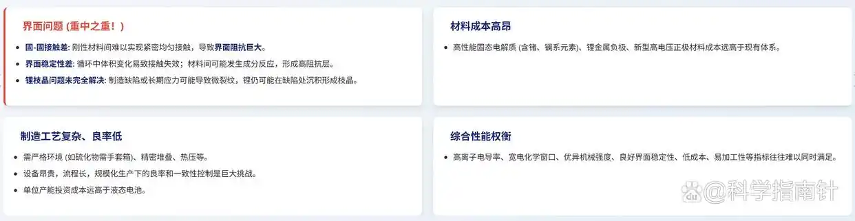 锂枝晶问题并未完全解决: 即使固态电解质机械强度高,但在实际制造中可能存在缺陷(孔洞、裂纹),或在长期循环中因应力累积产生微裂纹,锂金属仍可能在缺陷处优先沉积并形成枝晶,最终导致短路。需要更致密、均匀、高强度的电解质层和优化的界面设计。