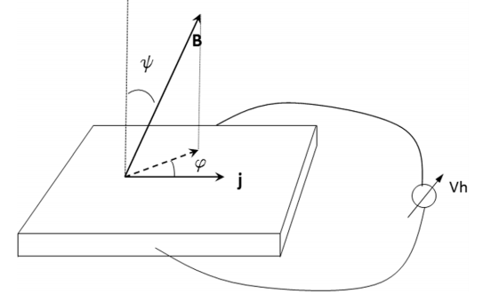 图1. 参考方程,与样品、电流和磁场有关的角度和方向示意图。[1]