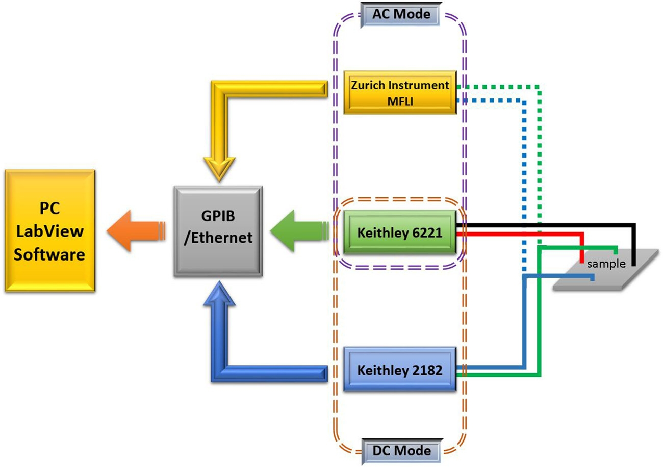 图2. 霍尔效应测量系统框图。电流源对于直流模式的纳伏特计或交流模式的锁相放大器都是通用的。[1]
