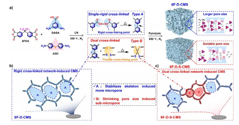 在本研究中,我们通过设计一种聚酰亚胺前驱体,通过双交联策略解决了这一长期存在的挑战,该前驱体既包含可以引起自交联的DABA基团,又包含通过形成S─S键形成交联的硫键。DABA组分经交联热解后脱羧形成刚性联苯结构网络(A型),而硫键诱导的柔性网络有利于形成狭窄网络(B型)。我们提出了热解过程中的双交联网络演化机制:A型网络保持了骨架的完整性并维持了微孔体积,而B型网络则经历了热致收缩。这种收缩促进了更密集的碳链堆积,压缩了骨架间的间距,并显著减小了孔隙大小,导致亚埃孔隙浓度增加了三倍。通过这种双交联策略,可以精确地调节CMSMs的亚微孔隙度。