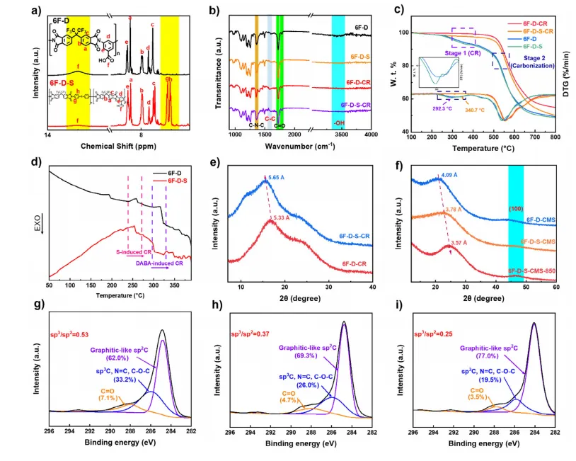 图2. a)¹H 核磁共振光谱。b)衰减全反射傅里叶变换红外光谱。c)原膜和CR膜的热重分析曲线。D)差示扫描量热法。e)和f)CR膜及CMSMs的广角 X 射线衍射。g)–i)所有CMSMs的C1s X 射线光电子能谱。