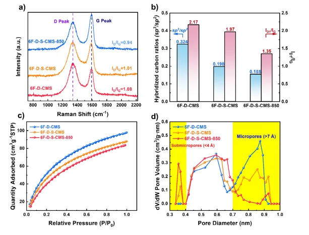 图3.a)所有CMSMs的拉曼光谱。b)所有CMSMs的sp³/sp²和ID₁/IG比值。c)和d)在 273 K 条件下所有 CMSMs的 CO2 吸附/解吸等温线及其通过NLDFT方法测得的孔径分布(PSD)。