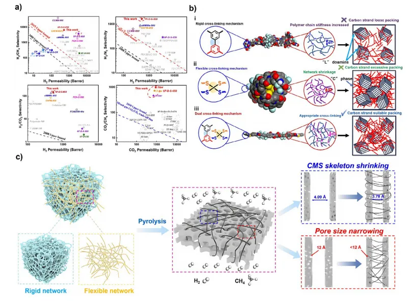 图4.a)原膜、交联膜及其衍生CMS与多种先进膜在H₂/CH₄、H₂/N₂、H₂/CO₂和CO₂/CH₄分离中的纯气体和混合气体分离性能对比。b)不同类型交联前驱体形成CMS的机制。c)双重交联网络诱导形成CMS的机制。2008、2015和2018年的上限边界线引自参考文献。