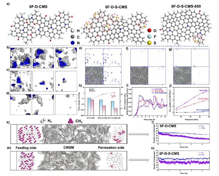 图5. a) 代表性融合碳层的详细视图;白色、灰色、蓝色、红色、青色和黄色球分别表示氢、碳、氮、氧、氟和硫原子。b) 以H₂为探针(dH₂ = 2.89 Å)时各CMS的自由体积分布。c) 以N₂为探针(dN₂ = 3.64 Å)时各CMS的自由体积。d) 以CH₄为探针(dCH₄ = 3.8 Å)时各CMS的自由体积。e) 6F-D-CMS、f) 6F-D-S-CMS 和 g) 6F-D-S-CMS-850 样品中CH₄分子的模拟吸附行为(吸附位点和体积以蓝色高亮显示)。h) 各CMSM中H₂和CH₄孔体积及其比值对比。i) 所有CMSMs的相应孔径分布(PSDs,0–10 Å)。j) 在100 K下CMSMs的模拟CH₄吸附等温线。k) 6F-D-CMS中H₂/CH₄混合气体(50%/50%)传输的模拟快照。l) 随时间推移,6F-D-CMS原料侧气体分子数量变化。m) 6F-D-S-CMS中H₂/CH₄混合气体(50%/50%)传输的模拟快照。n) 随时间推移,6F-D-S-CMS原料侧气体分子数量变化。