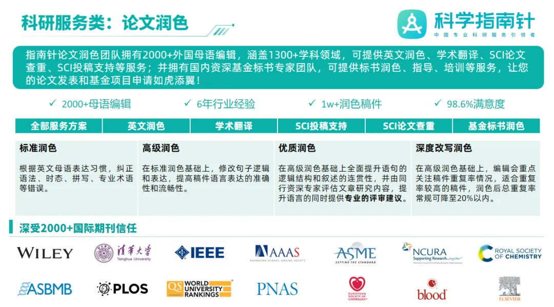 除了英文润色之外,科学指南针还提供学术翻译、SCI论文查重、SCI投稿支持等服务,团队拥有2000+外国母语编辑,涵盖1300+学科领域;并拥有国内资深基金标书专家团队,可提供标书润色、指导、培训等服务,助力您的科研成果登上国际舞台。