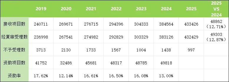 而2025年度项目申请集中接收期间共接收各类型项目申请433426项,经初审受理432429项,较2024年的384564项又增长12.71%(复审后应略微上涨),增幅巨大。而不予受理项目申请仅997项,近5年首次低于1000项,占比也仅有0.23%,较2024年大幅下降30.8%,历史最低。