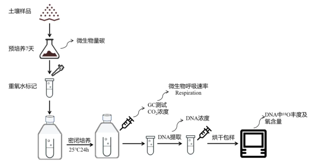 基于稳定同位素标记的18O-H2O培养法,其核心原理是利用重氧水标记新合成的微生物DNA,通过检测DNA 中18O的富集程度,结合呼吸 CO2 的测量,精确计算出微生物的生长速率和呼吸速率,进而得到 CUE。