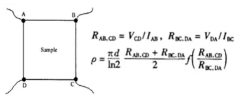 通过非邻近电极(如A-C)通电流,垂直施加磁场后测量电极对(如B-D)电压变化,结合公式: