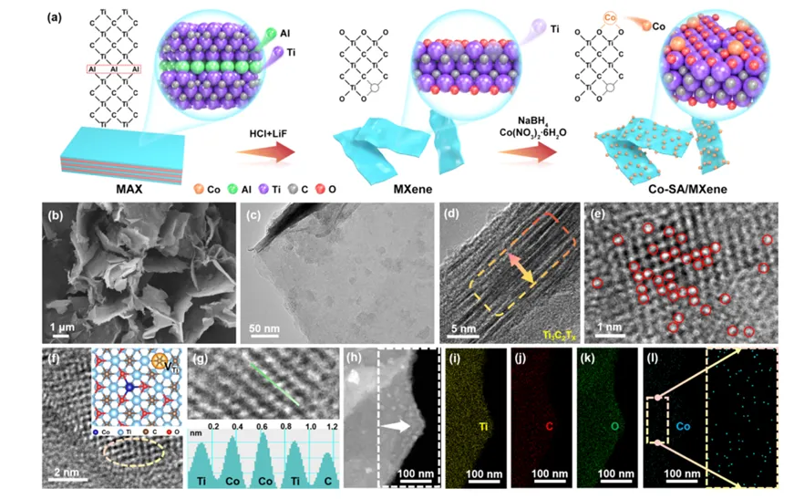 钛空位工程+单原子策略:通过HCl/LiF刻蚀与NaBH4还原,引入大量钛空位,增强了Co原子负载稳定性与电子转移能力。