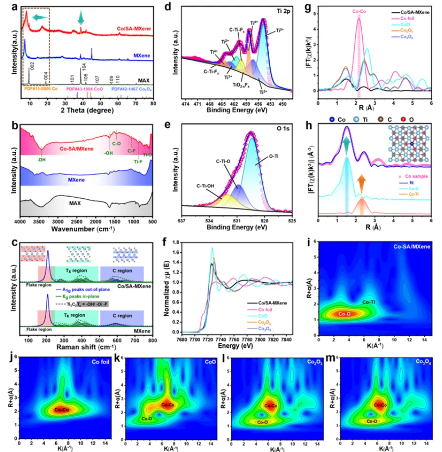 波列变换(WT)(Fig. 2i-m)确认单原子分散状态: Co-SA/MXene在3.4 Å⁻¹处有明显的强信号峰,对应Co–O配位;未出现高k值(约6.8 Å⁻¹)对应的Co–Co配位峰,进一步印证了Co完全以单原子形式分散。