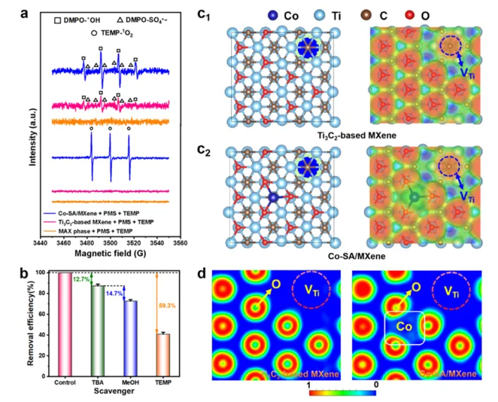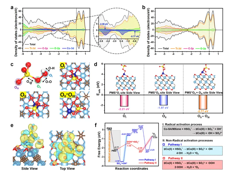 DFT揭示电子结构调控:计算表明Co引入后,MXene表面电荷重新分布,Co-O2/O3位吸附的PMS表现出最优吸附能(-2.77 eV),促进O-O键断裂并生成1O2。