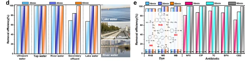 在实际水体及染料、抗生素等多种污染物降解中表现出快速高效的催化性能(Fig. 6d-e)。