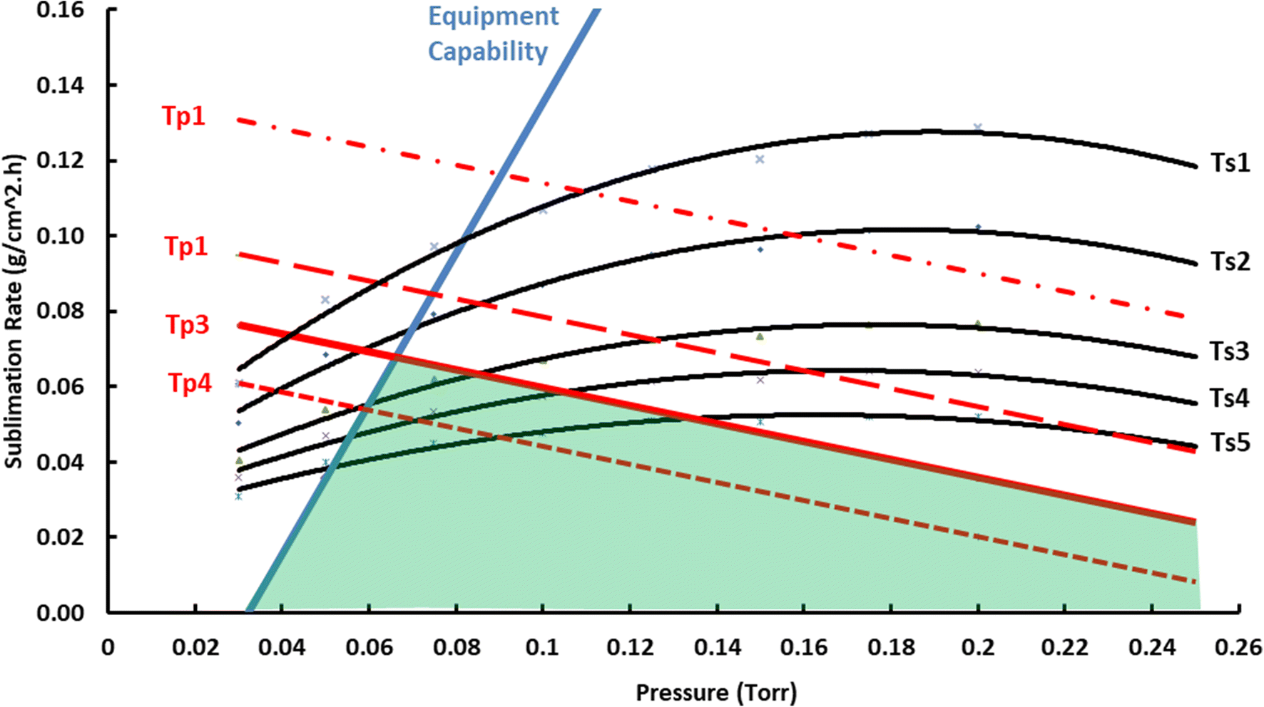 图1 具代表性的设计空间,表示装置能力曲线(蓝色轨迹)为两个边界之一。红色虚线表示产品温度等温线。红色实线表示临界产品温度等温线。所有的黑色痕迹表明货架温度等温线
