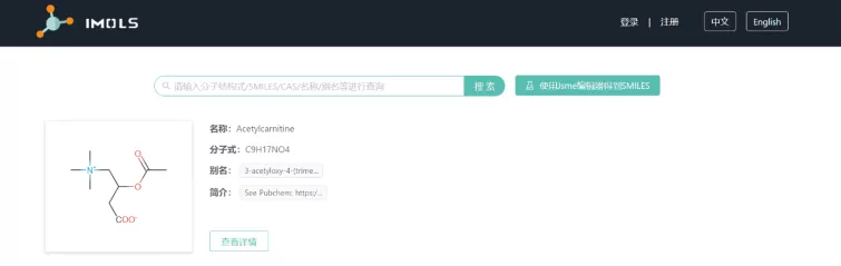 iMolS的使用界面,在其中可以通过CAS、SMILES、系统命名等进行检索,也可以绘制结构式检索。