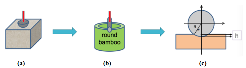 图3 圆竹压痕试验测定流程图:(a)木材硬度试验模型;(b)圆竹压痕试验模型;(c)压痕尺寸。