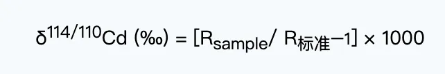 根据Cd含量,将所有样品和溶液标准品稀释至200ng/mL,加入111Cd-110Cd双峰溶液(111Cd-110Cd≈2),达到样品总Cd与双峰溶液的比例为1。采用基于MATLAB−的脚本和迭代的双−尖峰校正算法计算了双−尖峰样本的Cd同位素组成。此外,114Cd光束的强度为3V,摄取速率为50 μL min−1。用Nist3108 镉的标准溶液做校正参数计算公式如下其中R114Cd/110Cd