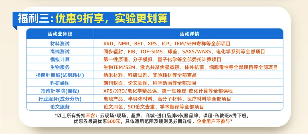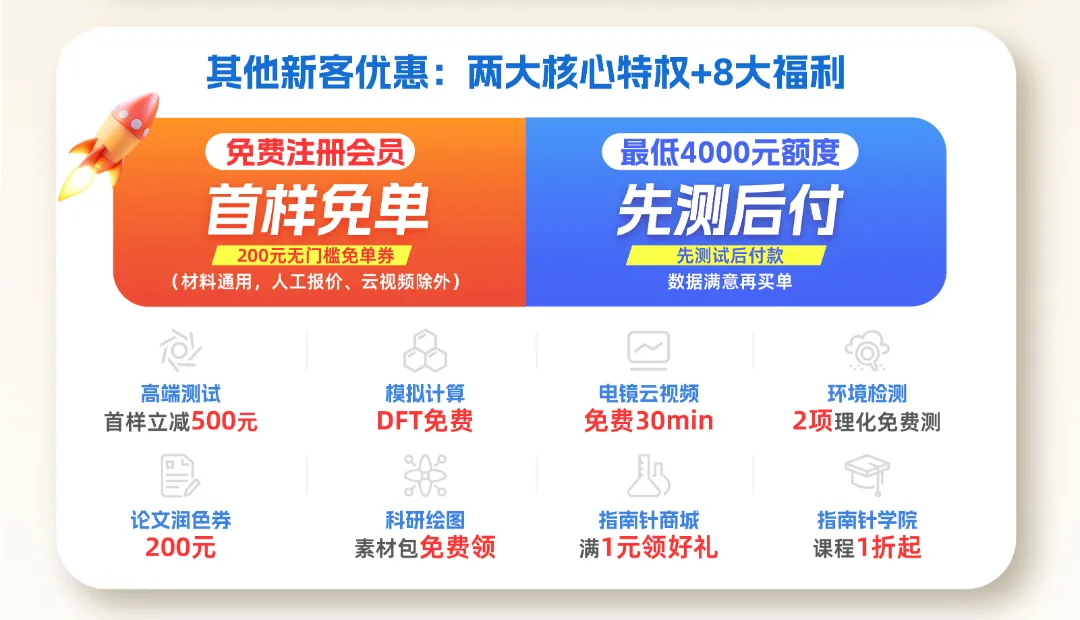 【摘要】 科学指南针2025开学季活动来袭!9月8日-30日,注册新客下单即抽100%中奖福利,免费领研一/研二/研三专属科研礼包,材料测试、模拟计算等全线服务九折优惠低至36元起。更有预付充值最高赠13%测试费、首样免单、先测后付等八大新客特权,助您科研之路更轻松!