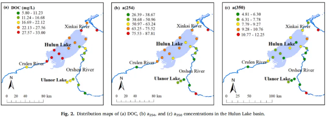 Fig. 2:呼伦湖流域溶解有机碳(DOC)、紫外吸收系数a(254)和a(350) 的空间分布