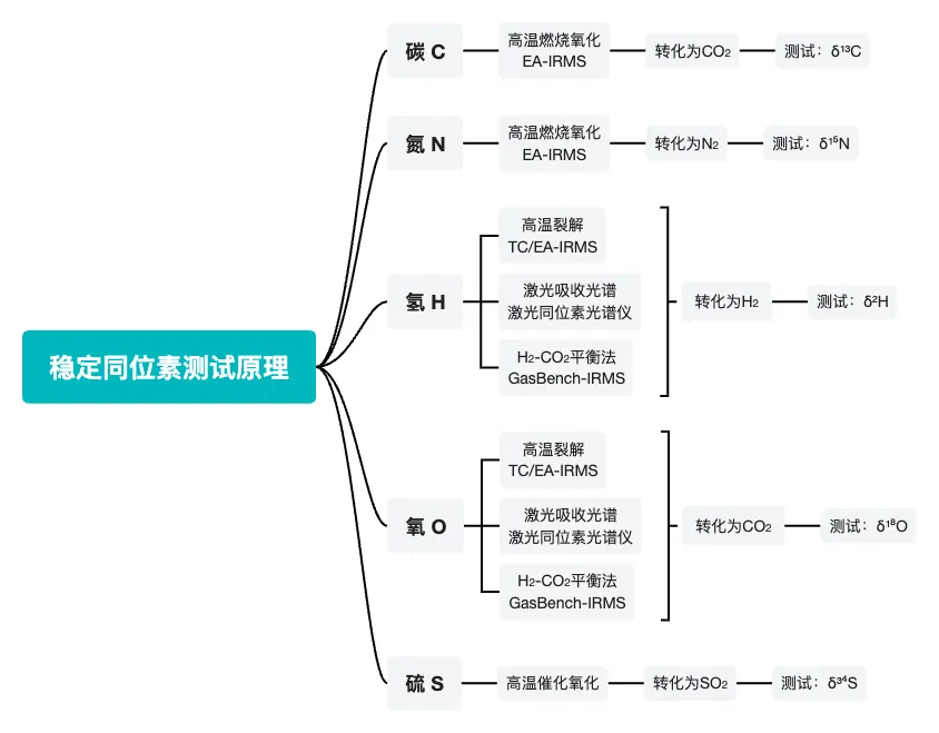 常规稳定同位素通常是将元素转化为气体后进入IRMS检测(下方测试原理仅针对较为普遍的测试方法),检测基本原理可见下图: