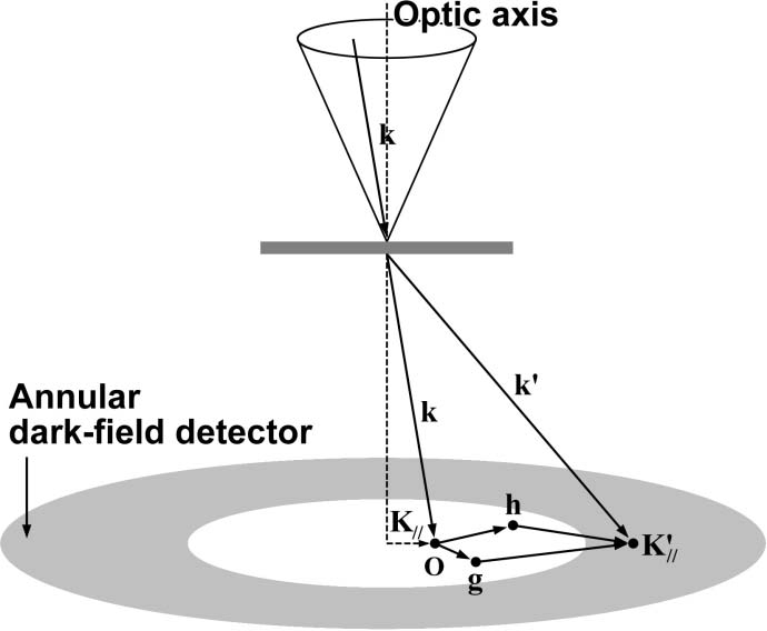 图1. 对于波矢量为k的倾斜部分入射平面波,衍射波g, h与TDS电子的波矢量k0之间的关系示意图。