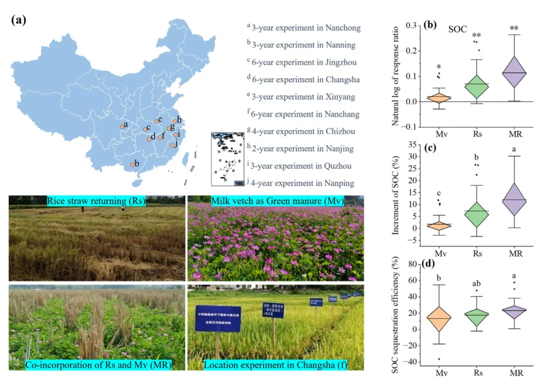 突破以往局部或单点研究,首次提供了区域尺度不同还田措施对SOC固持的实证数据和机制解析,量化了典型还田措施(绿肥还田、稻草还田及其组合)在区域尺度上的SOC固持效率及其机制。