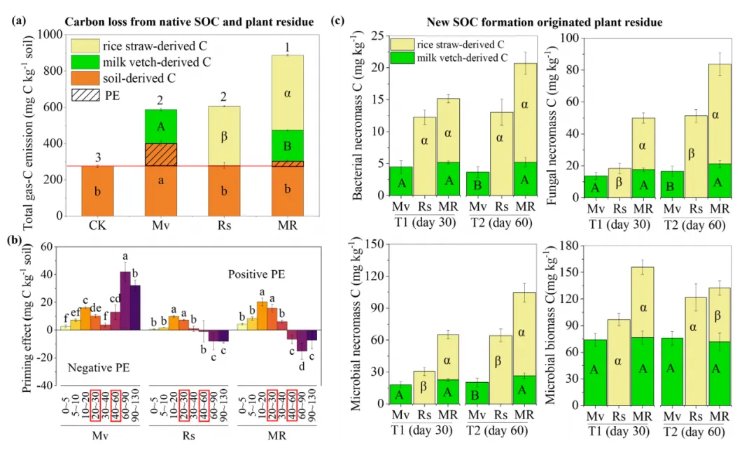 揭示低质量(稻草)与高质量(绿肥)植物残体混合还田可协同提升固碳效率