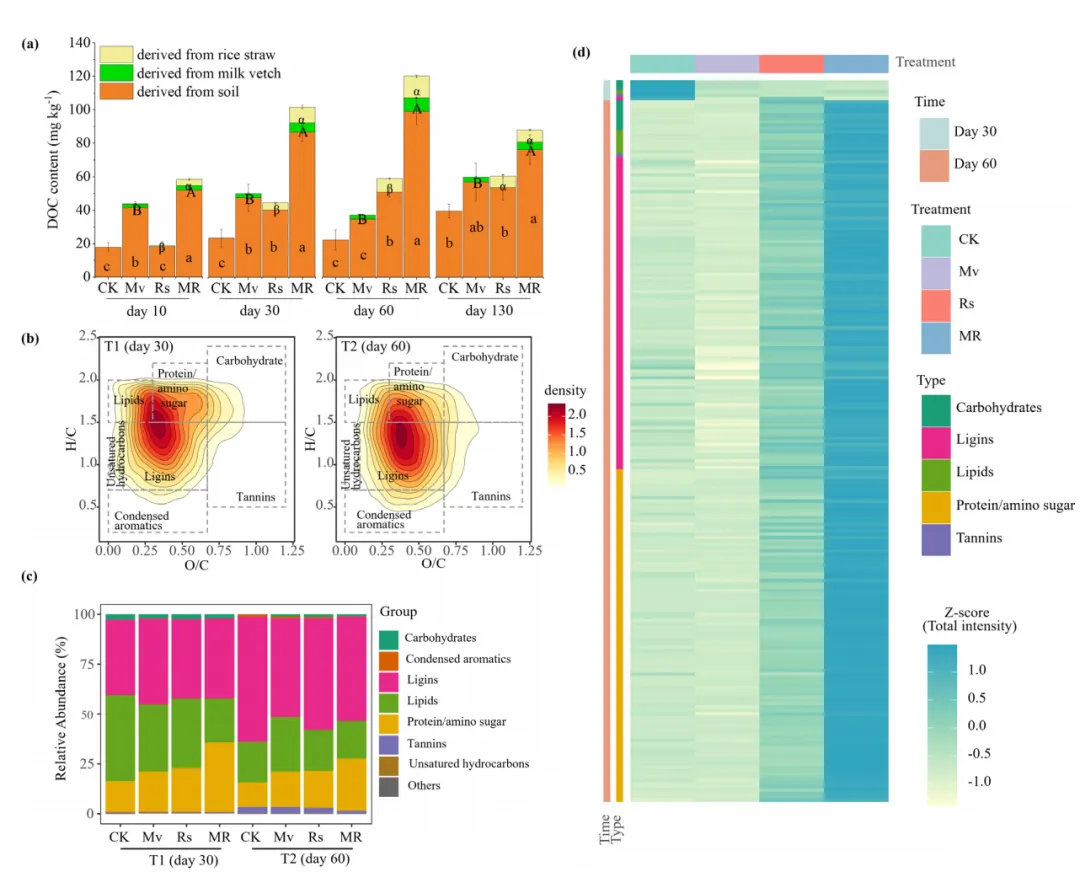 • (b):通过高分辨率质谱(FT-ICR MS)表征了分子组成空间分布,其中48.2%为木质素类化合物,26.5%为脂类。MR处理显著降低顽固性分子丰度,同时增加易降解组分。