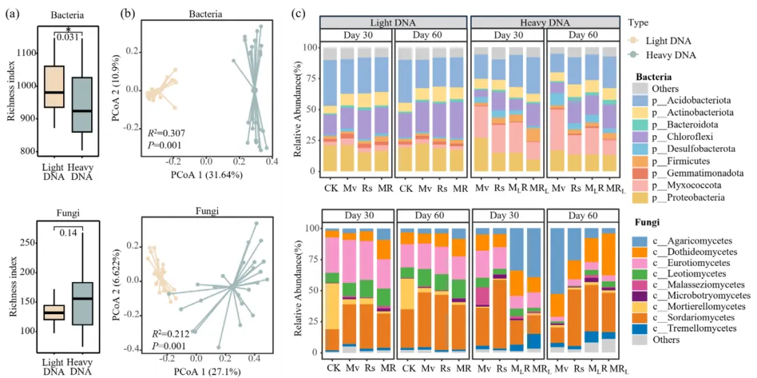 Fig. 4:同化原生土壤有机碳(轻DNA组分来源)与植物残体(重DNA组分来源)的微生物群落结构与组成