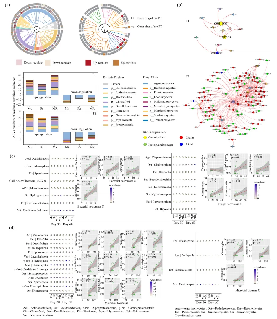• (a):原生SOC矿化菌群以酸杆菌门和绿弯菌门为主,其丰度与顽固性SOC(如木质素类分子)降解显著正相关植物残体分解菌群以变形菌门和放线菌门占优,其丰度与易降解碳组分利用效率直接关联