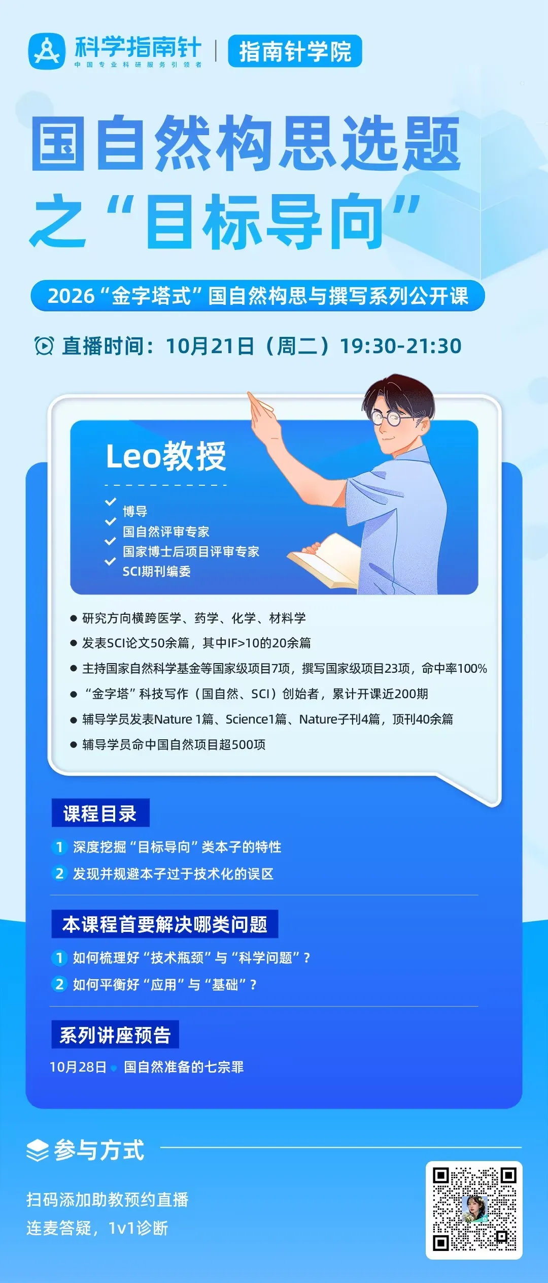 结合最新政策导向与前沿科学,国自然评审Leo老师在10.21晚19:30将直播讲解「国自然构思选题之 “目标导向”」,手把手带你深度挖掘“目标导向”类本子的特性,系统梳理“技术瓶颈”与“科学问题”,找准“应用”与“基础”的平衡点,并设置1V1连麦答疑环节,当场诊断你的选题难点~