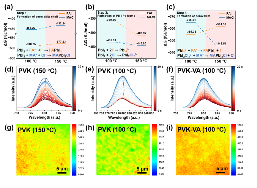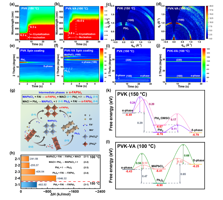 本研究提出甲基氯化铵(MACl)蒸汽辅助(VA)法,通过精准解析PbI₂→中间相(MAPbCl₃/PbI₆)→α-FAPbI₃的反应路径,实现低温制备突破。