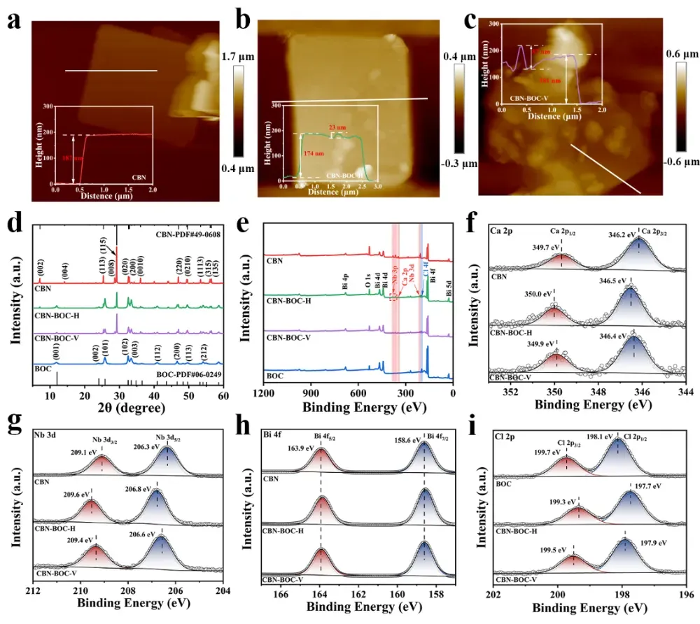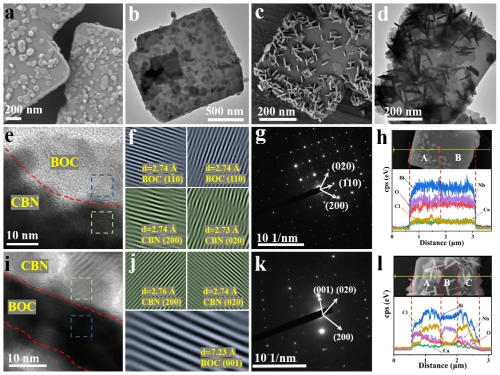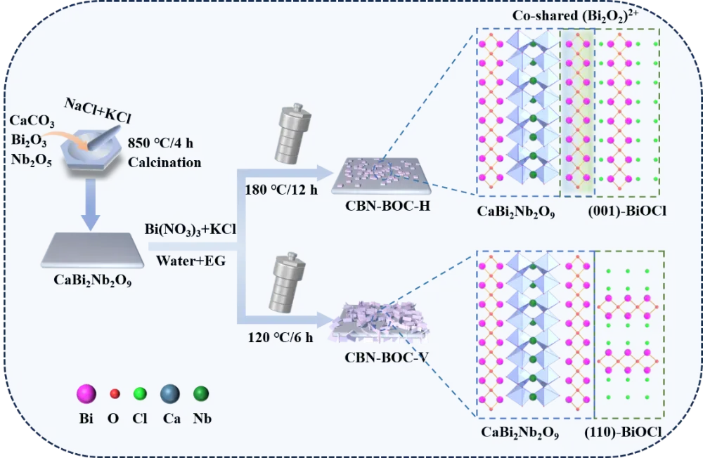 采用熔盐法制备CaBi₂Nb₂O₉(CBN)材料,通过原位水热法实现BiOCl(BOC)纳米片在CBN(001)晶面的可控外延生长,构建具有独特界面共享结构的CBN-BOC-H异质结。