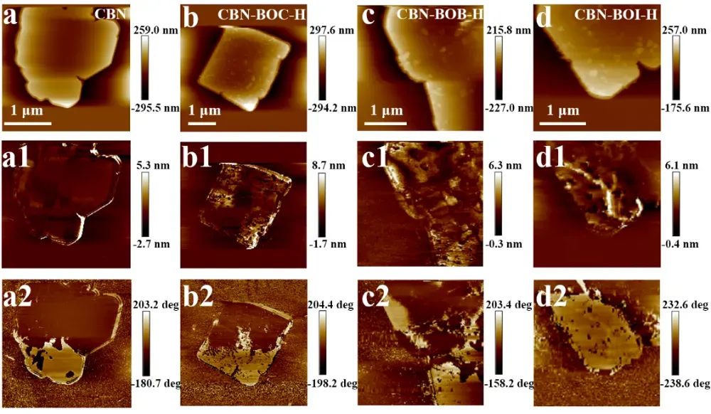 PFM表征显示CBN-BOC-H样品具有最优压电响应,振幅图呈现最明显对比度
