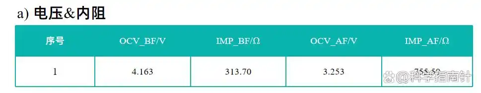 电压(OCV)和内阻(IMP)是反映电池内部 “健康状况” 的关键指标。实验前,电池电压为 4.163V,内阻 313.70mΩ;穿刺后,电压跌落至 3.253V,内阻飙升至 755.50mΩ—— 这是因为内部短路后,电能传递紊乱,内阻增大、电压随之下降。
