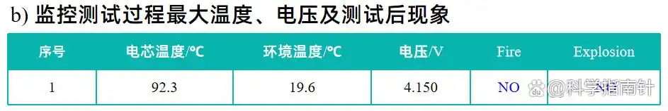 电芯温度最高达到 92.3℃,虽有明显升温,但并未触发起火或爆炸;观察 1 小时后,电池仍保持安全状态。