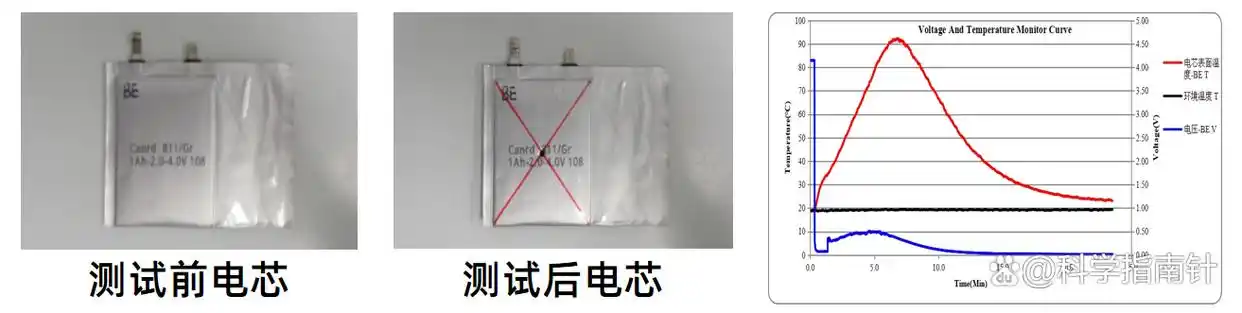 从电芯外观也能直观看到测试前电芯完整洁净,测试后虽有变化,但无燃烧、爆炸痕迹。结合电压 - 温度曲线,温度上升后逐渐回落、电压趋于稳定,都说明电池成功扛住了 “穿刺挑战”。