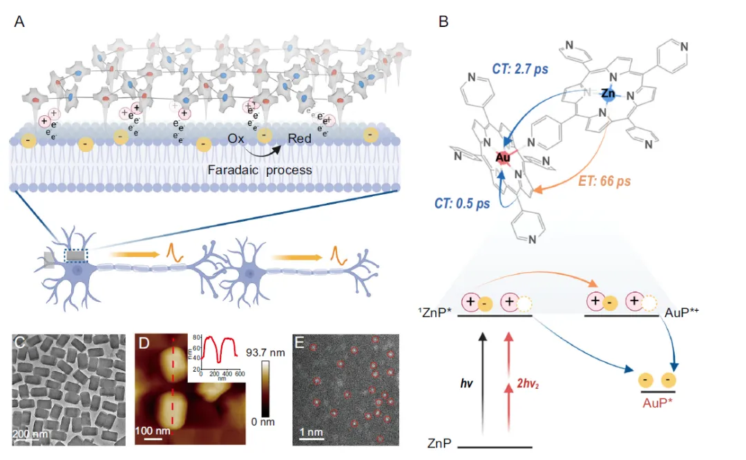 研究团队通过离子交换策略开发锌金双金属卟啉光电极(ZnAuPN),利用超快电子转移实现高效神经电刺激。