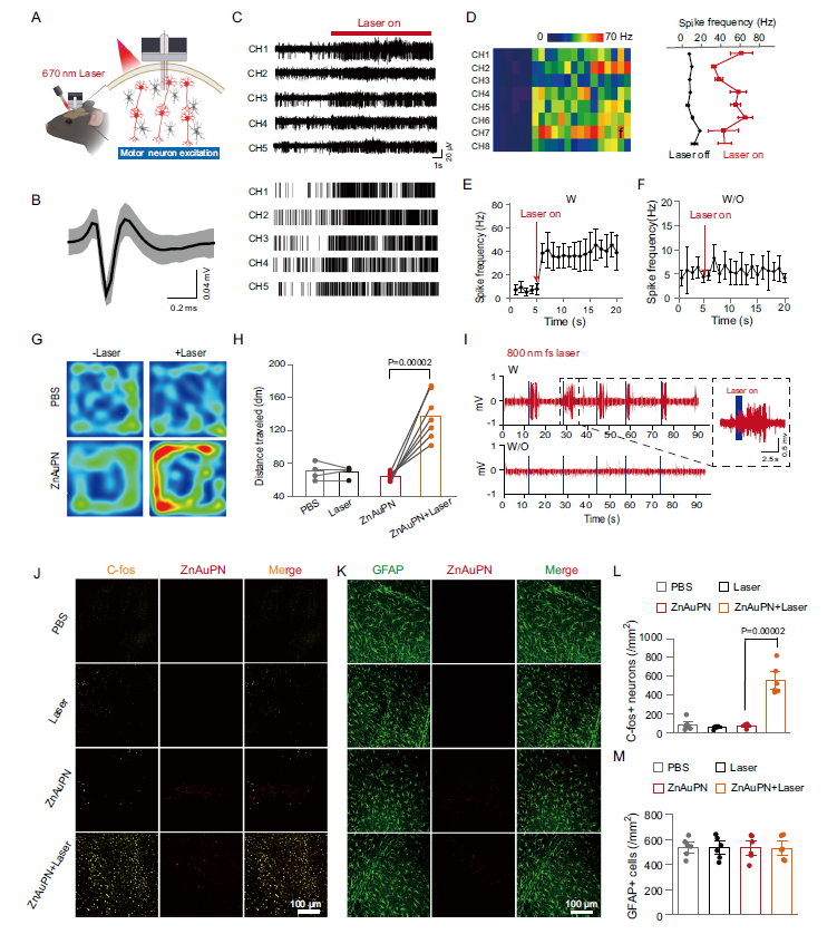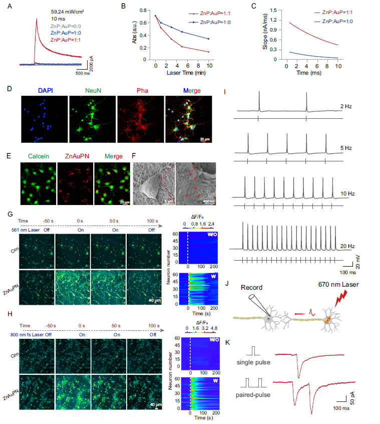 通过膜片钳技术评估ZnAuPN光电性能,证实其高效光电流产生和神经电活动调控能力。